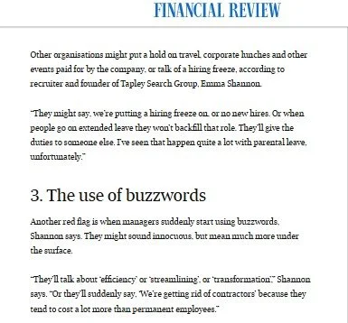 In September 2025 Emma and Tapley Search Group were mentioned and Emma was interviewed for the article “Geoff has been made redundant before. This time he saw it coming” in the AFR.